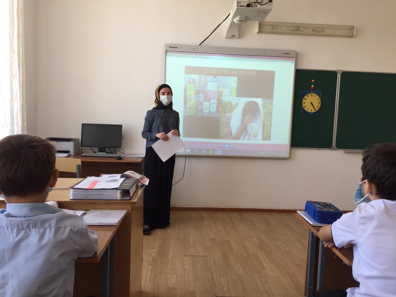 13.10.2020г. классным руководителем 7 –го класса Муртазовой Х.М. была проведена беседа на тему: «Токсикомании ЗОЖ»