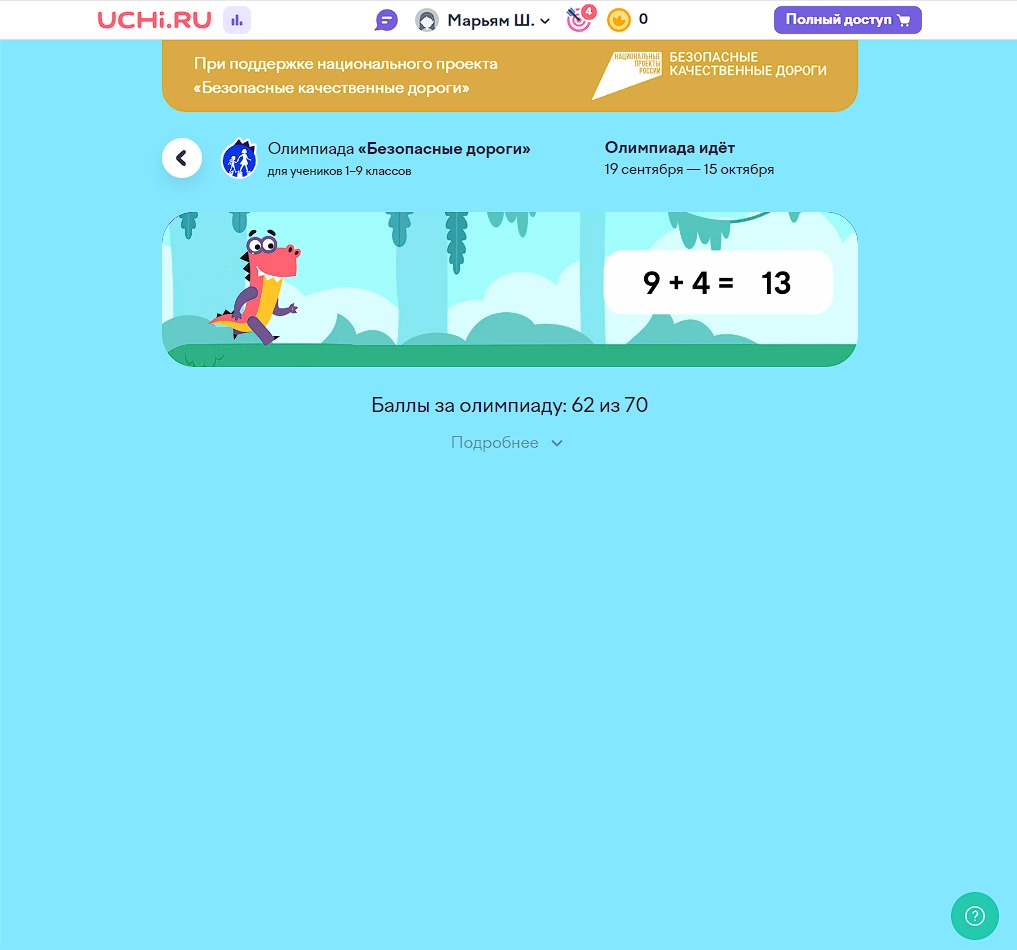 09.10.2023В целях информационного сопровождения национального проекта «Безопасные качественные дороги» на образовательной платформе Учи.ру в период с 19 сентября по 15 октября в МБОУ«Бурунская СОШ» проходит всероссийская онлайн-олимпиада «Безопасные дороги» для учеников 1-9 классов.