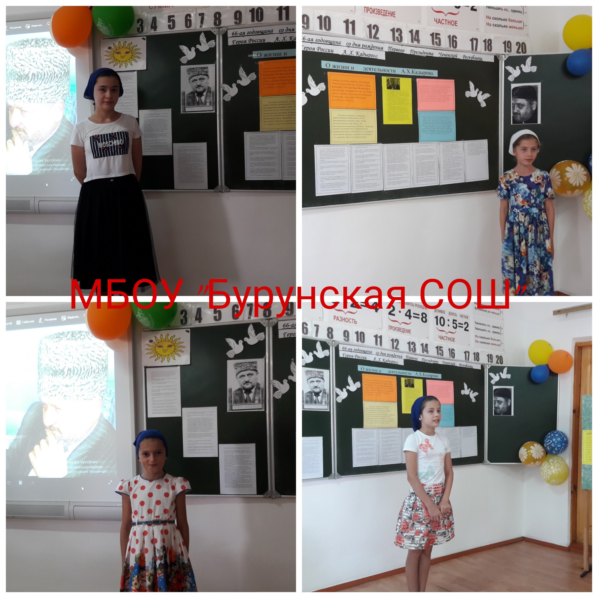 Конкурс стихов «Даймехкаан турпалхо». В конкурсе приняли участие учащиеся 3,4, 6, 7 и 8 класса (Ибрагимава И., Багашева А., Ибрагимова Х.,Таболаева М.)