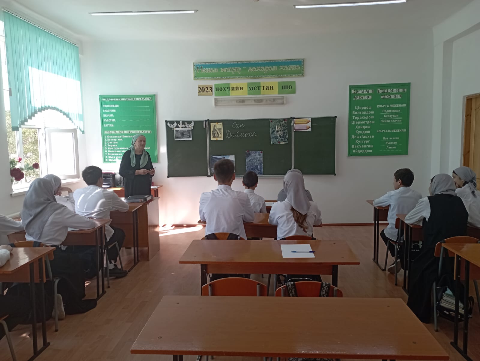 26.10.2023В соответствии с указом Главы Чеченской Республики от 28 ноября 2022 года № 245 «Об объявлении 2023 года в Чеченской Республике Годом чеченского языка» в МБОУ «Бурунская СОШ» учителем чеченского языка Бахаевой З.С. был проведён урок «Сан Даймохк».