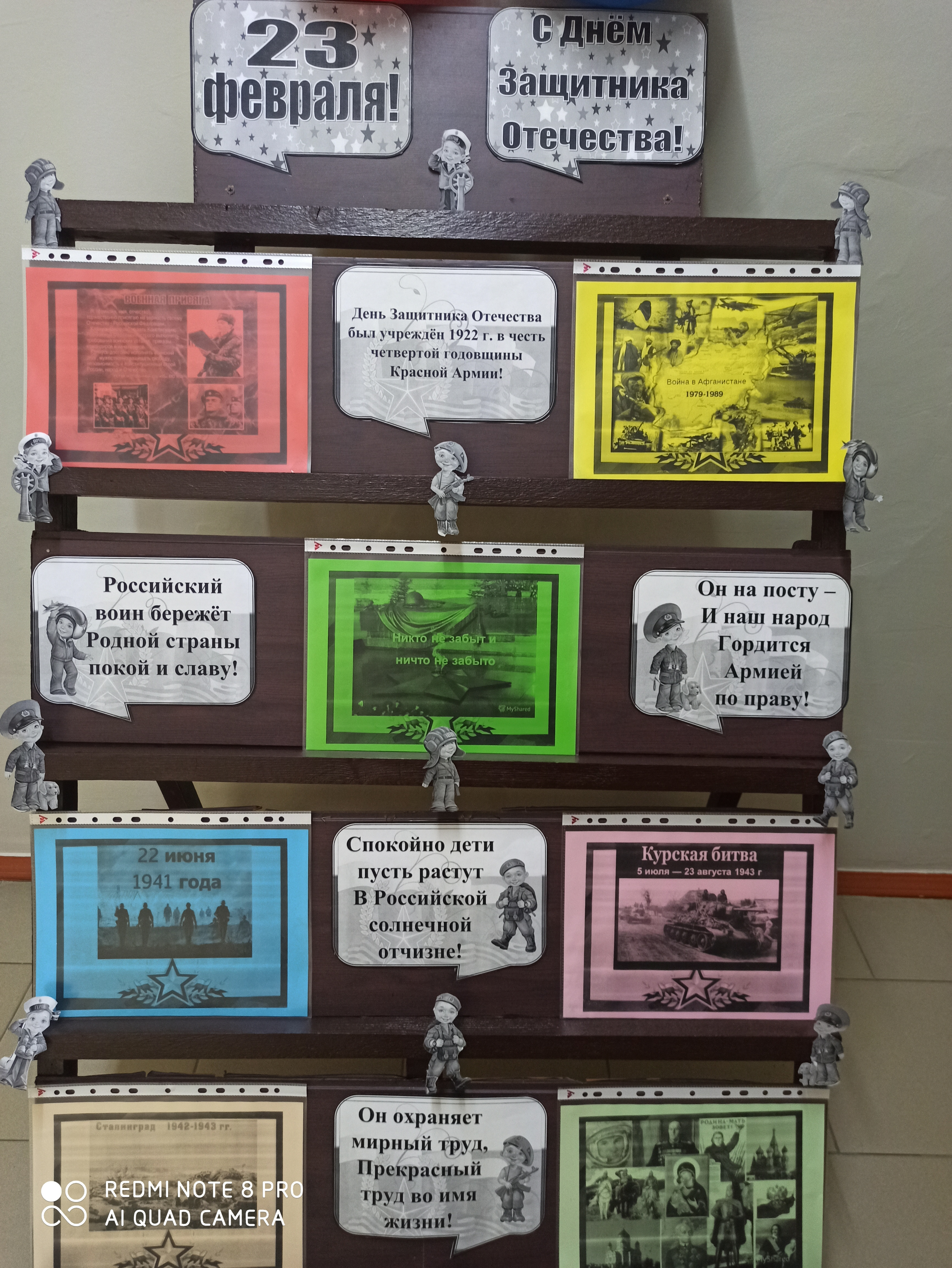 В предверии праздника, библиотекарем Шидиевой Э.З.,был оформлен стенд с поздравлениями защитников Отечества. Информация на стенде даёт представление об историческом прошлом нашей страны и героических подвигах наших героев, которые сыграли решающую роль в истории Отечества.