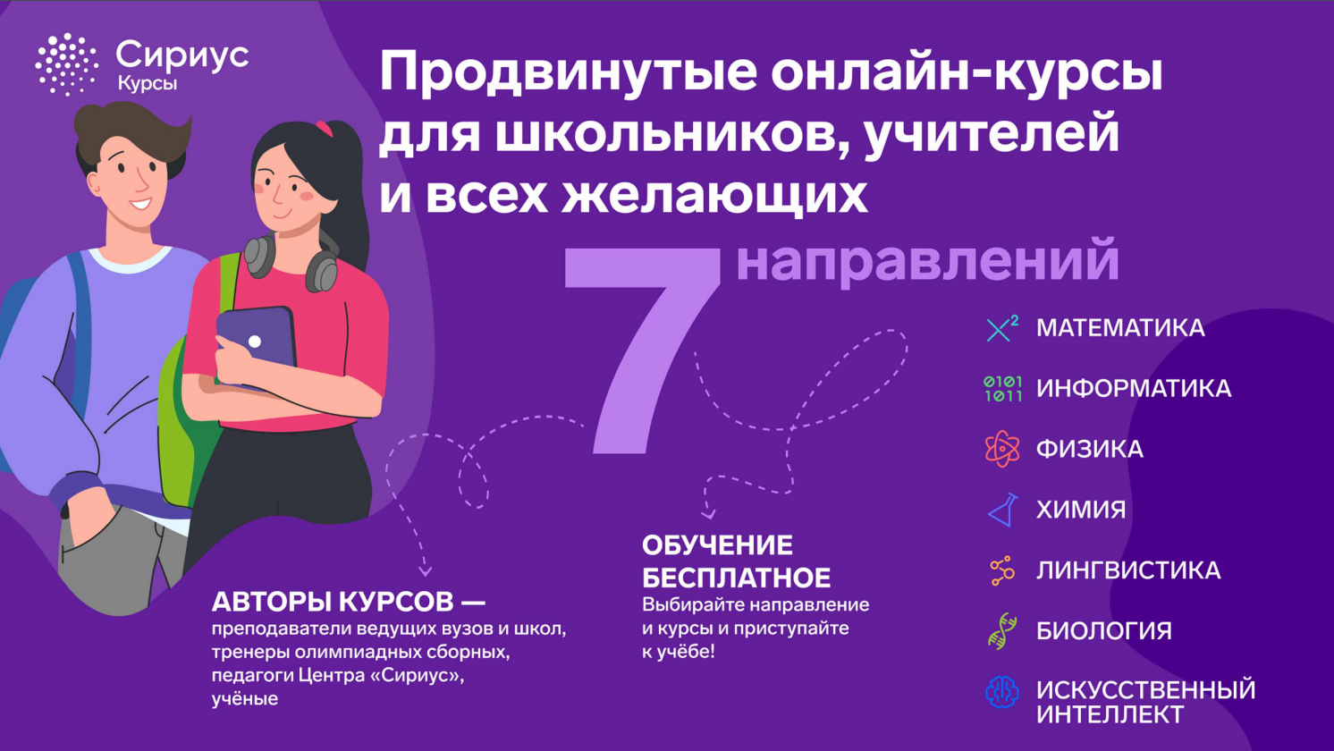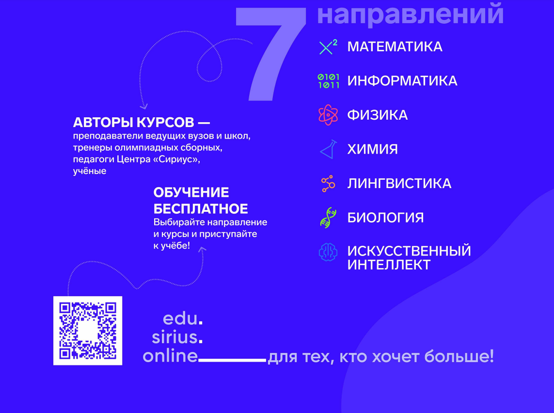 Команда авторов и методистов Сириус.Курсов продолжает формировать полную линейку курсов по естественно-научным предметам с 7 по 11 класс. Все курсы разрабатываются в единой концепции, проходить их можно в удобном темпе, выстраивая собственную образовательную траекторию.