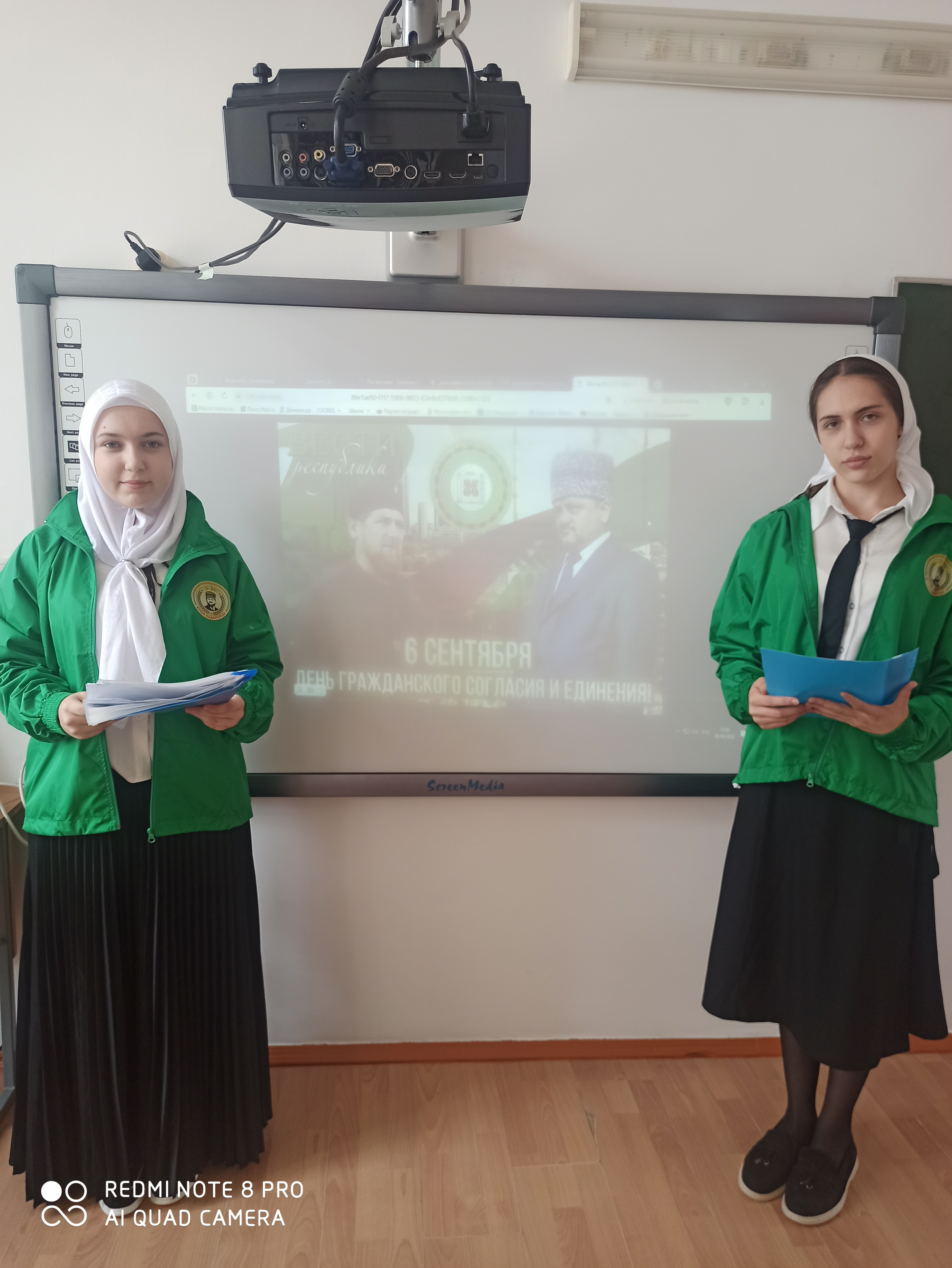 В те трудные для всей республикигоды все это приобретало особую актуальность.С тех пор 6 сентября стал знаменательной датой в новой истории ЧеченскойРеспублики. Ахмат Хаджи Кадыров объединил расколотое общество иостановил произвол и беззаконие, проведя референдум, на котором жителиЧечни приняли Основной закон Чеченской Республики и сделали свой выбор –жить в составе Российской Федерации.В связи с этим в МБОУ «Бурунская СОШ» были проведены беседы,классные часы, посвященные Дню гражданского согласия и единения.Отряд «Юные Кадыровцы» с учащимися провели беседу на тему: «Мывместе».