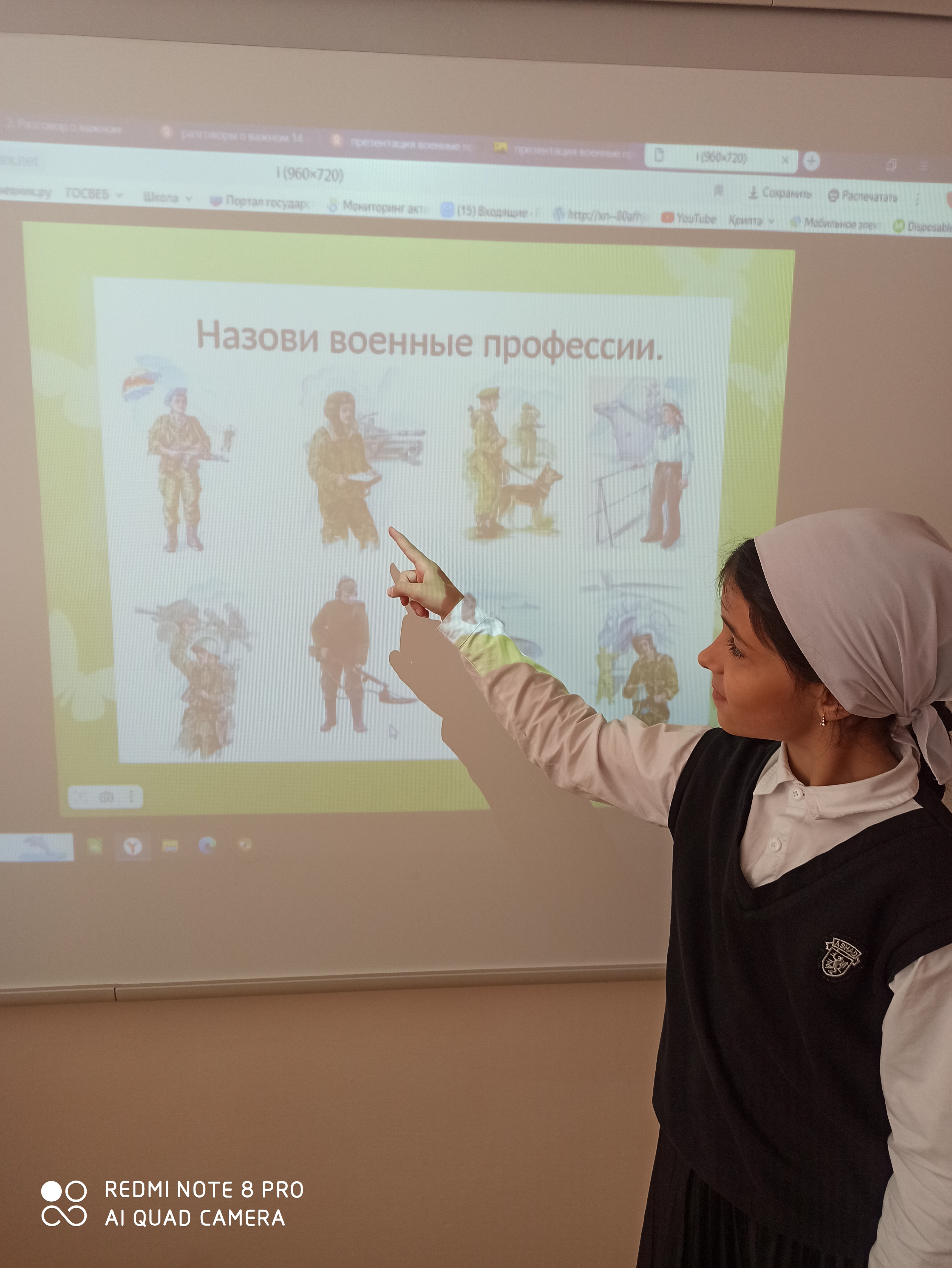 Учащиеся отметили, что служба эта «и опасна, и трудна». Военнослужащие часто рискуют жизнью и здоровьем, защищая мир и покой на земле. Они должны любить свою Отчизну и свой народ, иметь глубокие знания, крепкое здоровье, быть готовы быстро и четко выполнить любой приказ. Все профессии военных почетны и важны. Наша страна гордится своей армией, ее отважными воинами. Все военные готовы в любой момент защищать мирное население, то есть нас с вами. Военный - профессия героическая, уважаемая и нужная!
