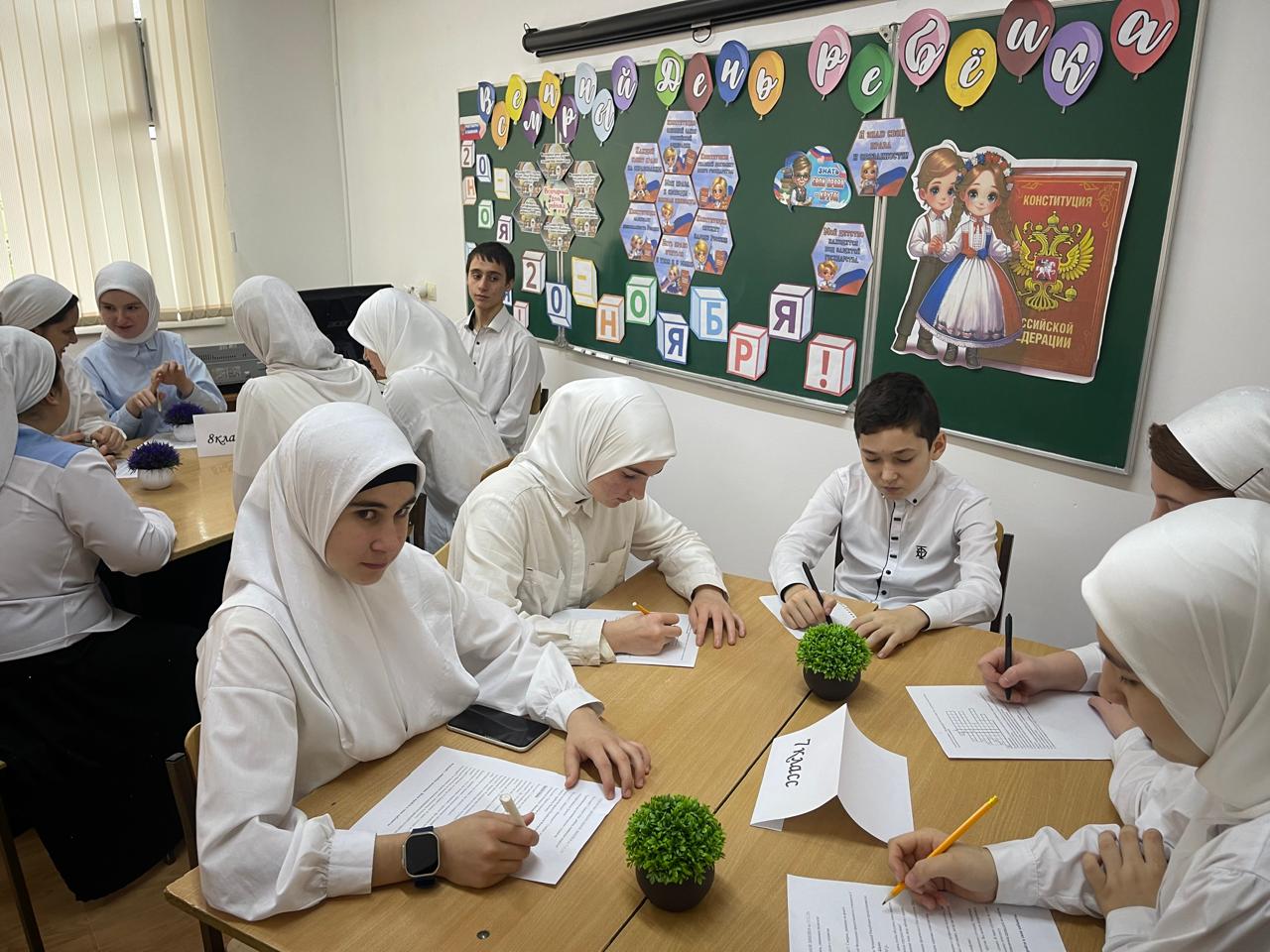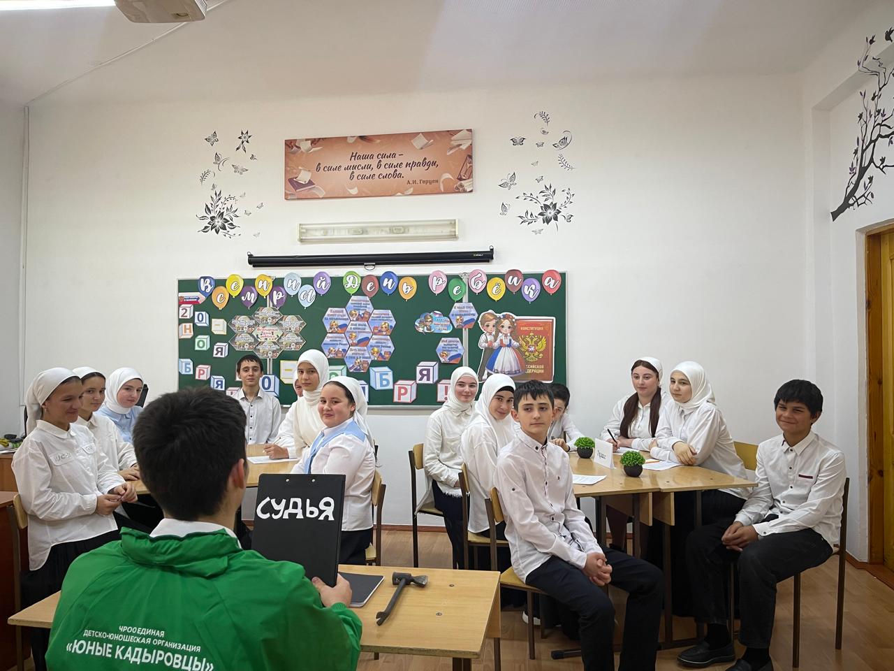 17.11.2025«17 ноября в нашей школе состоялось важное и познавательное мероприятие — День правовой грамотности. Чтобы погрузить учащихся в мир законов и прав, педагоги организовали для учеников 7 и 8 классов деловую игру "Судья и подзащитные". Основной целью было научить ребят понимать свои права и грамотно их защищать.Помогал им в этом участник патриотического отряда Юный Кадыровец. который уверенно руководил процессом в роли судьи. Его серьезный подход и знание процедуры помогли создать атмосферу настоящего судебного заседания.»