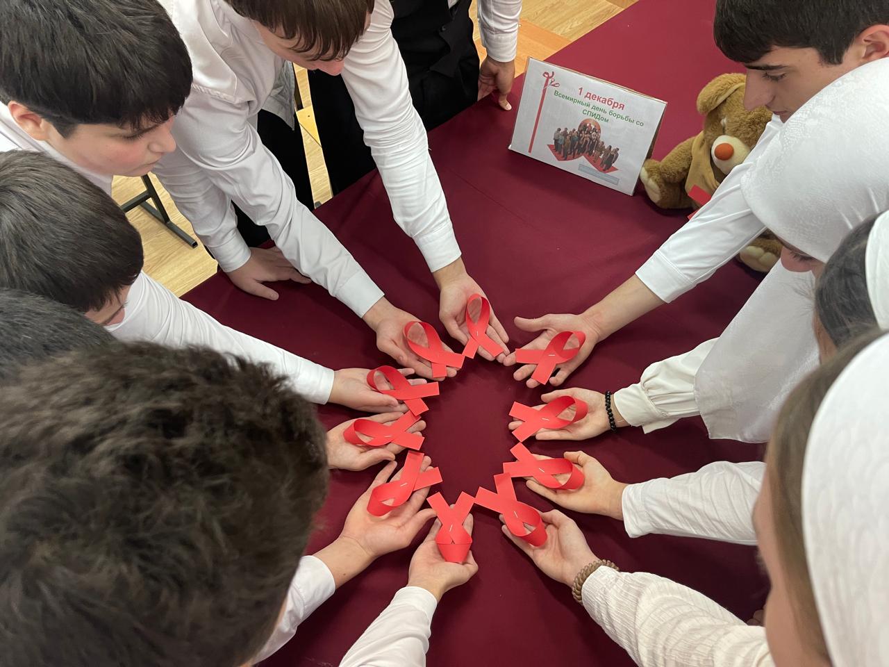 Красная лента — международный символ солидарности в борьбе со СПИДом — стала одним из ключевых элементов классного часа.