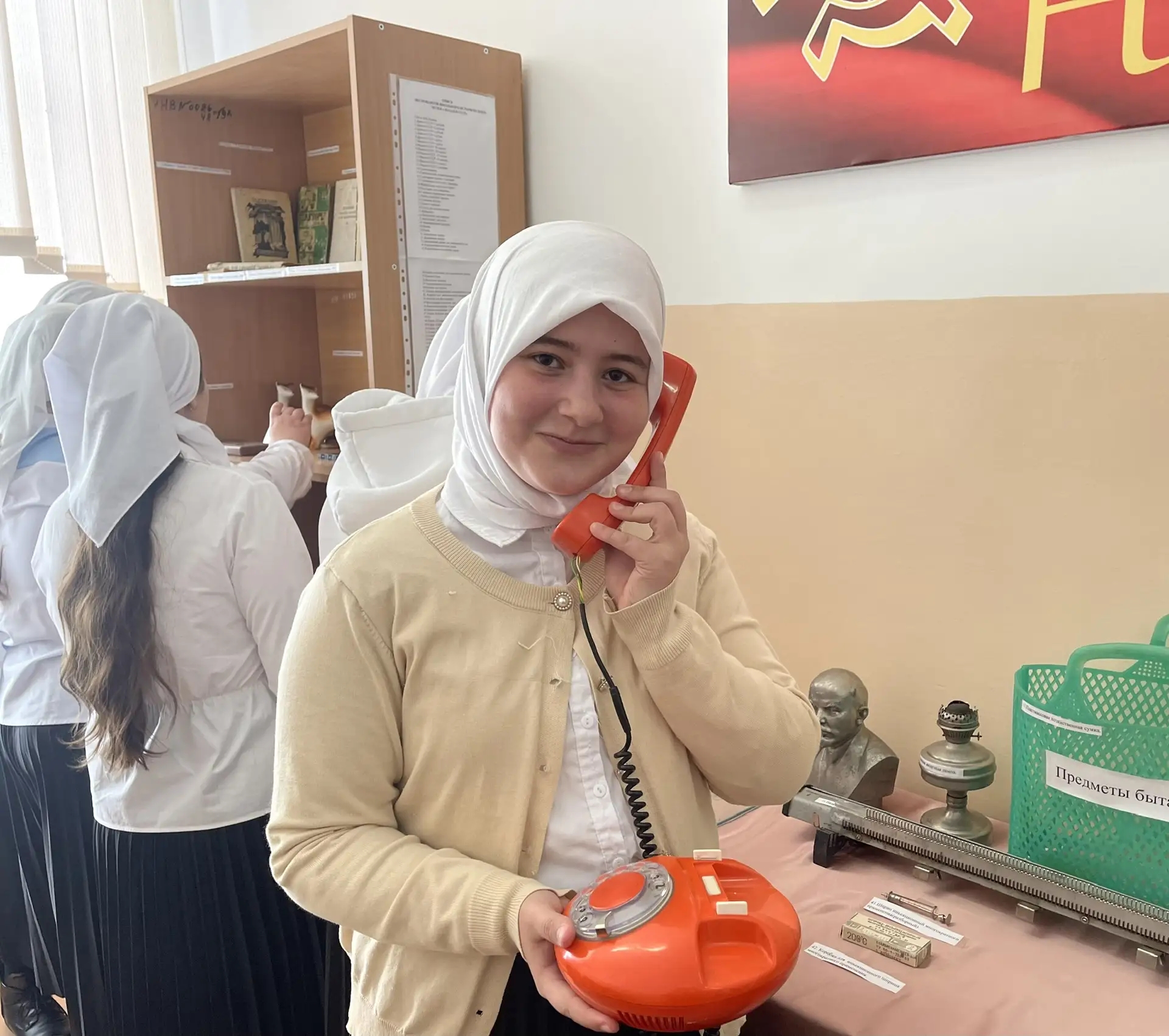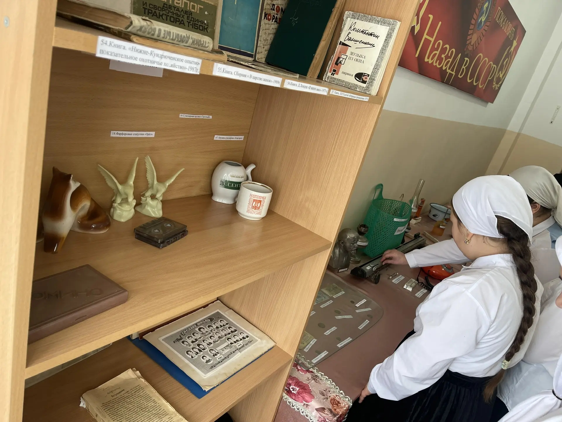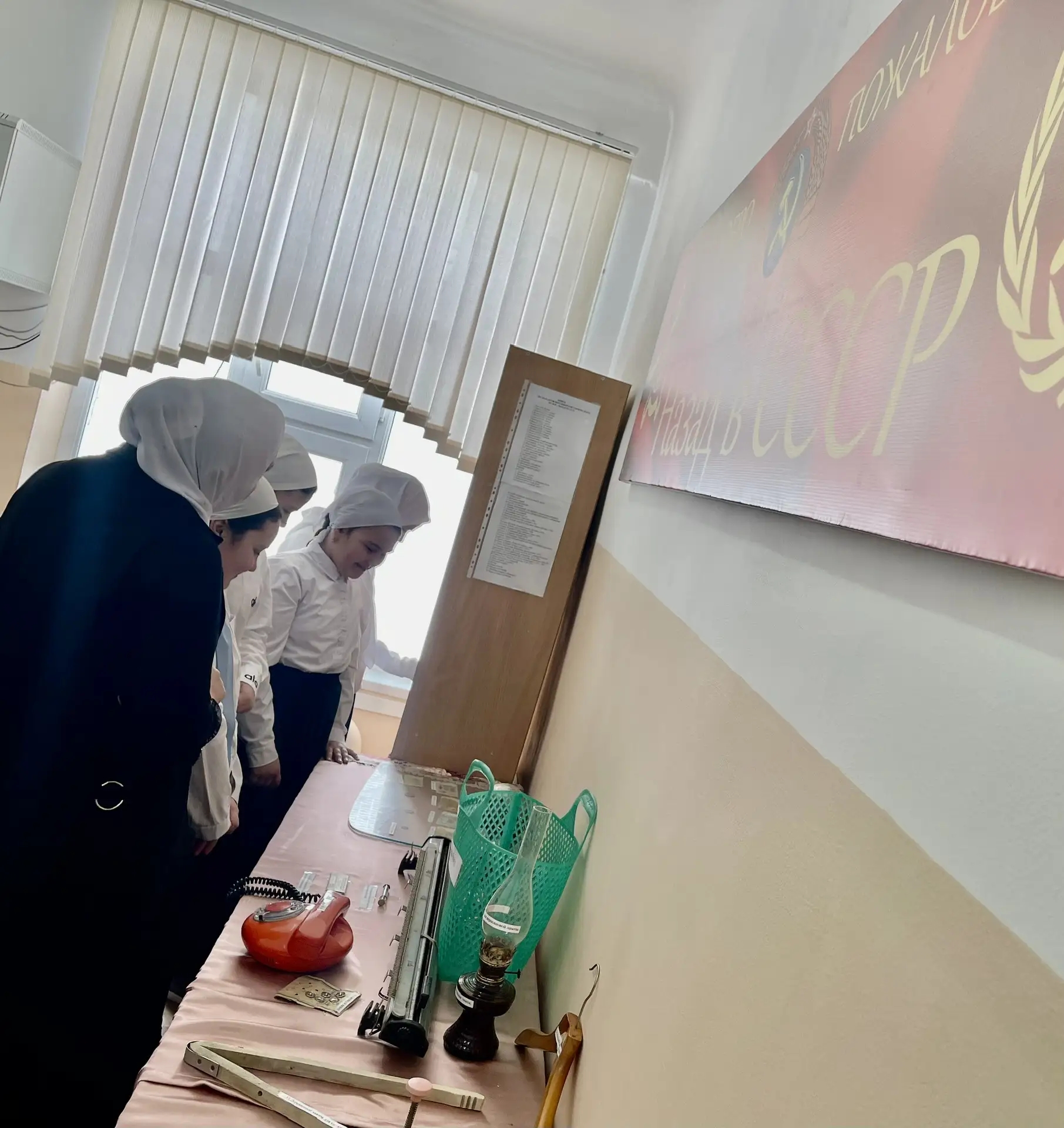Ребята с большим интересом рассматривали старые фотографии, школьную форму прошлых лет, награды и работы выпускников. Аида Зиявдиновна рассказала, как создавалась школа, о её традициях и знаменитых учениках.
