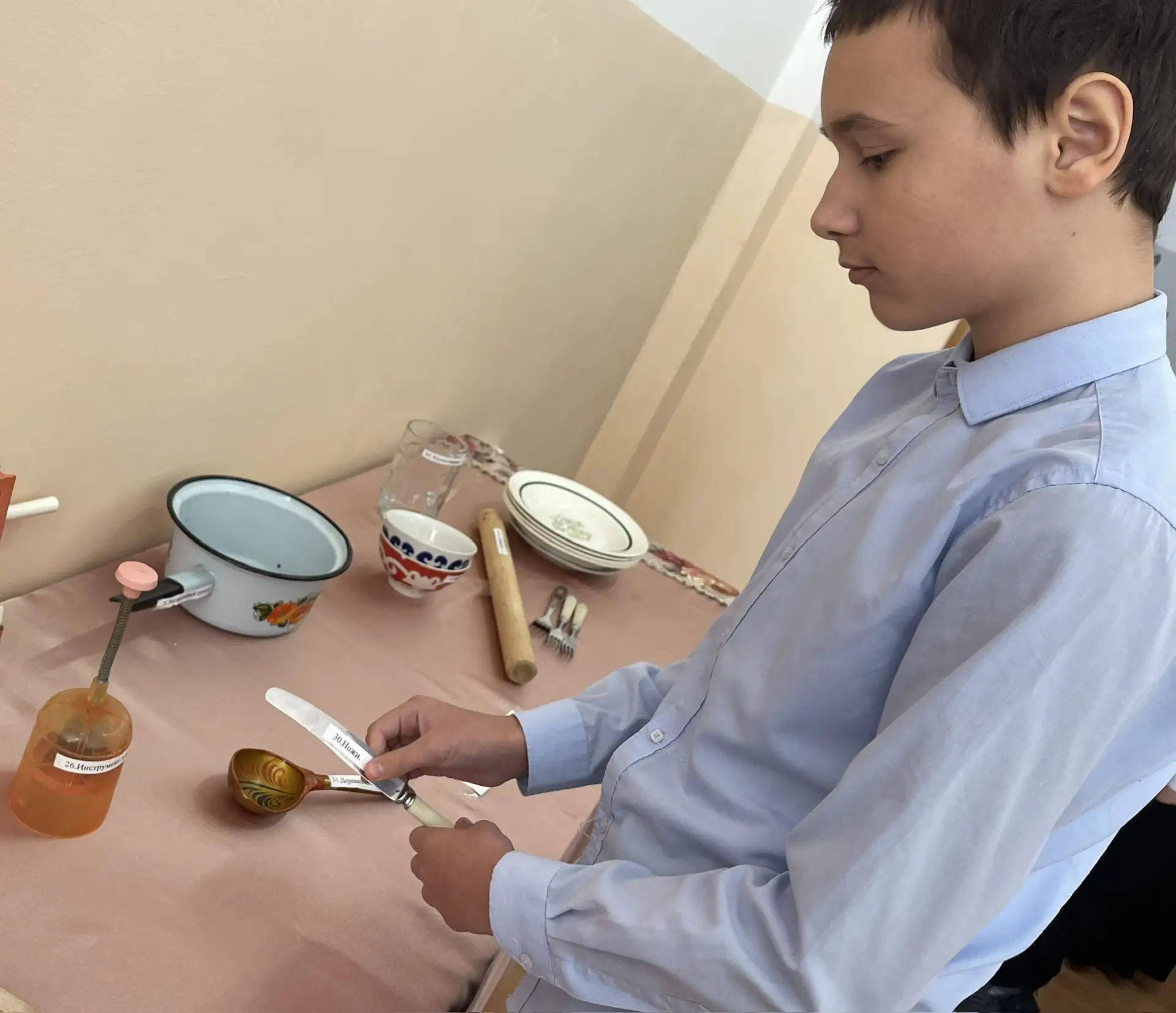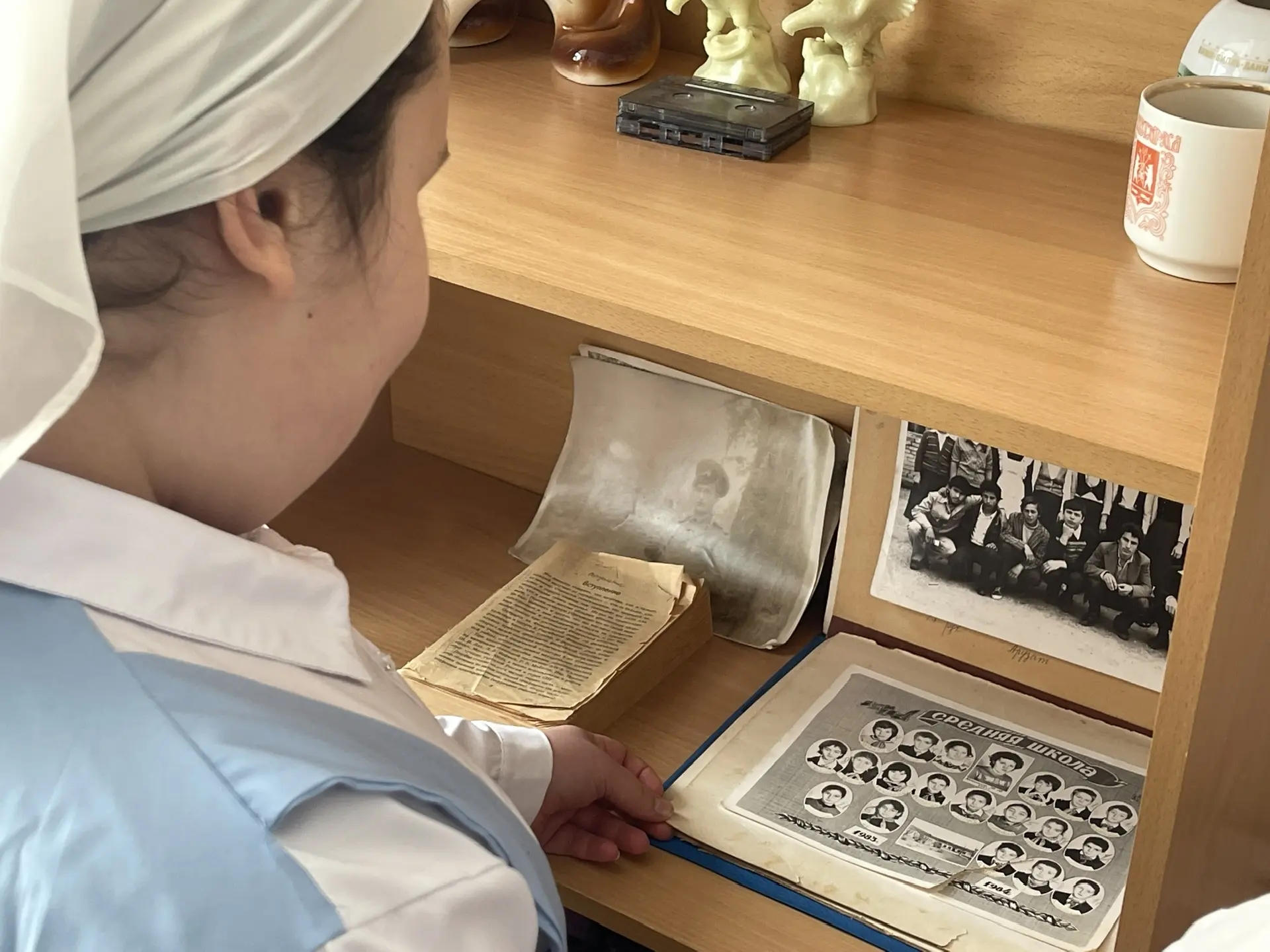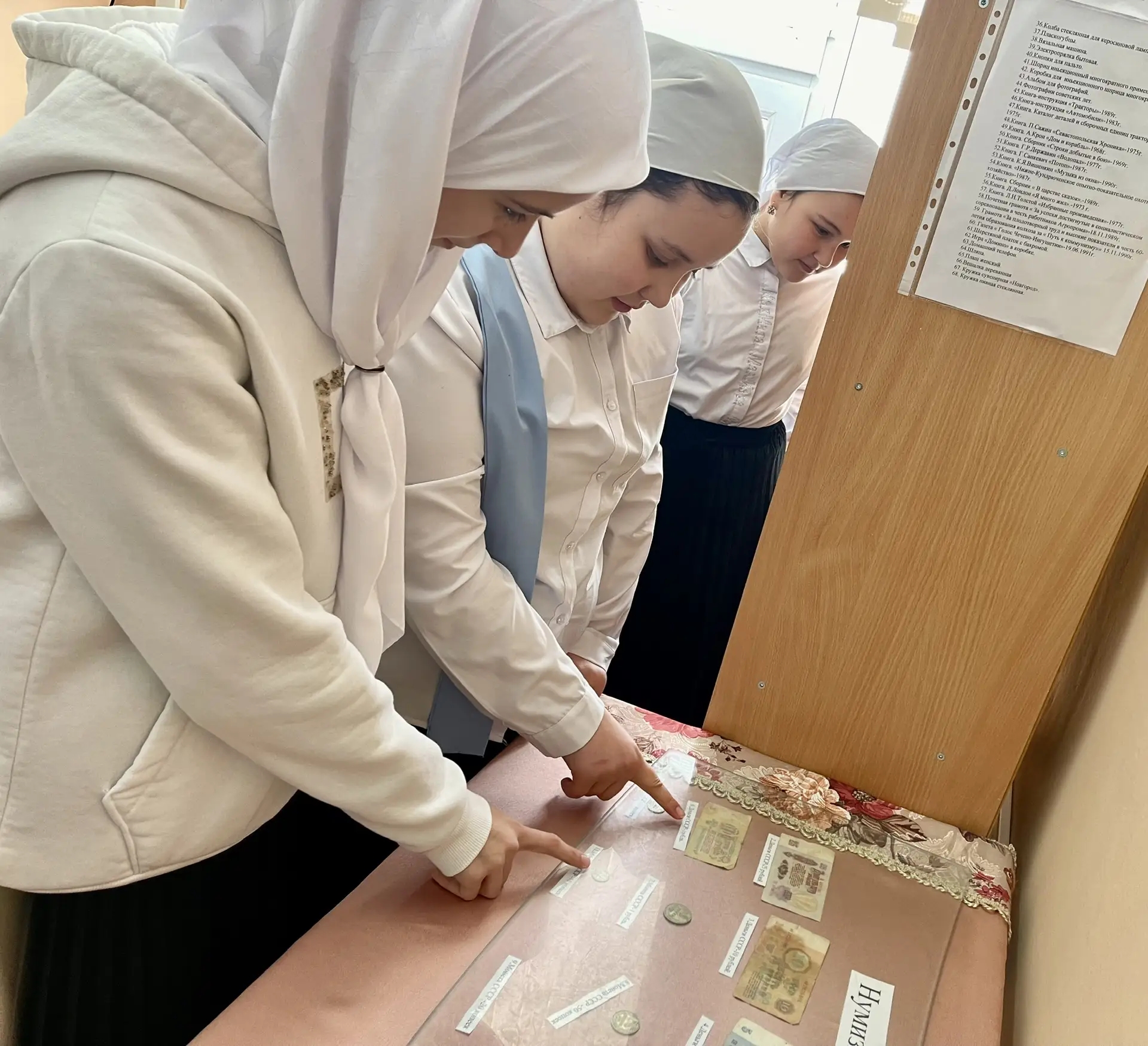 Ребята с большим интересом рассматривали старые фотографии, школьную форму прошлых лет, награды и работы выпускников. Аида Зиявдиновна рассказала, как создавалась школа, о её традициях и знаменитых учениках.